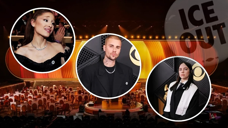 Las manifestaciones también se hicieron visibles en la alfombra roja, donde numerosos asistentes llevaron en sus atuendos insignias con el mensaje “Fuera ICE”. Entre ellos destacaron figuras como Justin y Hailey Bieber, la legendaria Joni Mitchell, el cantante Jordan Tyson y la actriz y cantante Helen J. Shen.