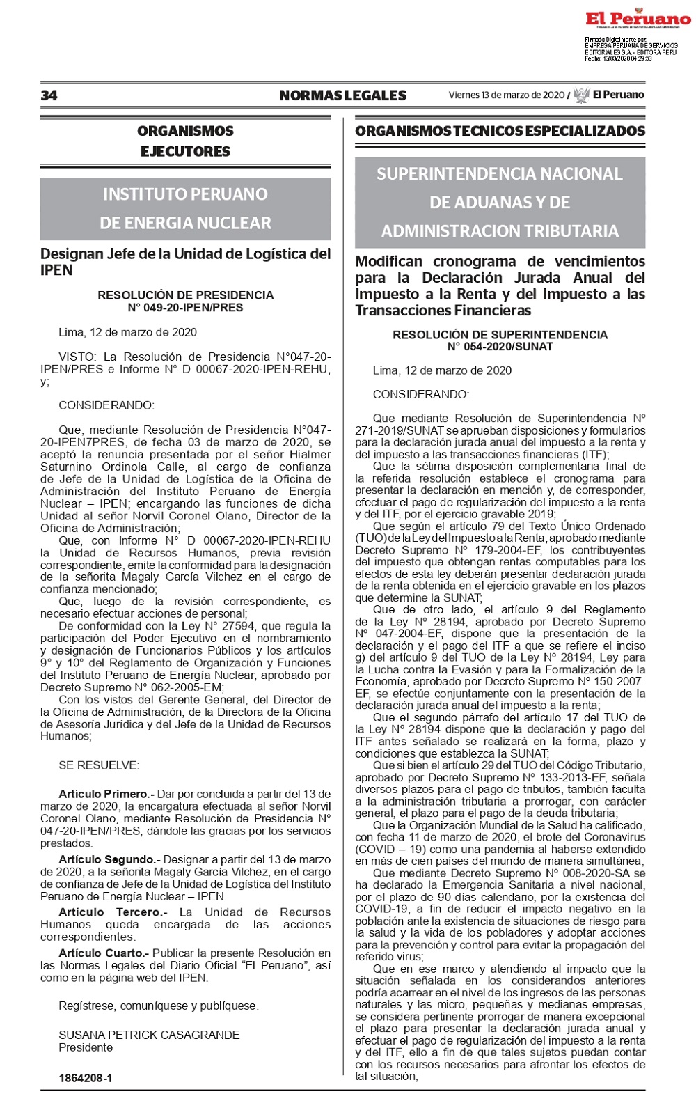 Inicialmente, este grupo de contribuyentes, con ingresos que en el 2019 no superaron las 2,300 unidades impositivas tributarias (UIT), equivalente a 9 millones 660,000 soles, debía cumplir con esta obligación entre el 25 de marzo y el 8 de abril, indicó la Superintendencia Nacional de Aduanas y Administración Tributaria (Sunat).