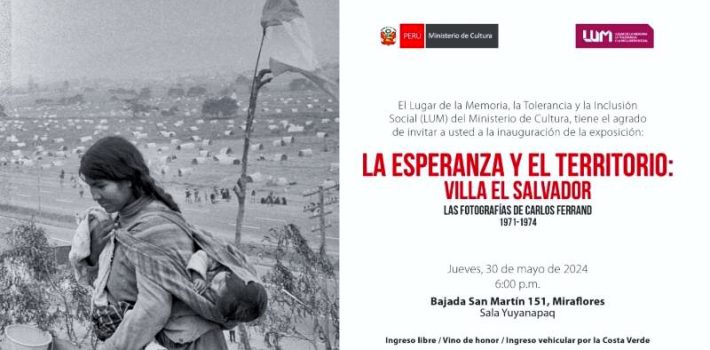 El Lugar de la Memoria, la Tolerancia y la Inclusión Social (LUM) del Ministerio de Cultura inaugurará este jueves 30 de mayo, a las 6:00 p. m., la muestra “Villa El Salvador: La Esperanza y el Territorio. Las fotografías de Carlos Ferrand 1971-1974”, una exposición que presenta, por primera vez en el Perú, las impactantes … Sigue leyendo “La esperanza y el territorio”: exposición en LUM sobre fundación de Villa El Salvador