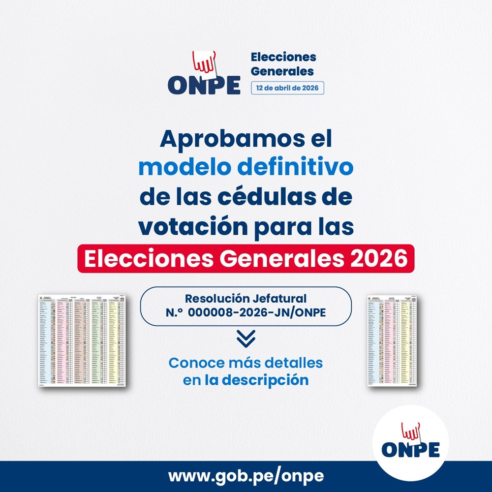 La Oficina Nacional de Procesos Electorales (ONPE) publicó los diseños definitivos de las cédulas de sufragio para las Elecciones Generales 2026 y la Segunda Elección Presidencial, aprobados mediante la Resolución Jefatural 000008-2026-JN/ONPE, publicada en el diario El Peruano.