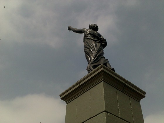 Lamentablemente, esta escultura fue mutilada por desconocidos que quitaron su antorcha, dejando solo una mujer con el puño en alto.