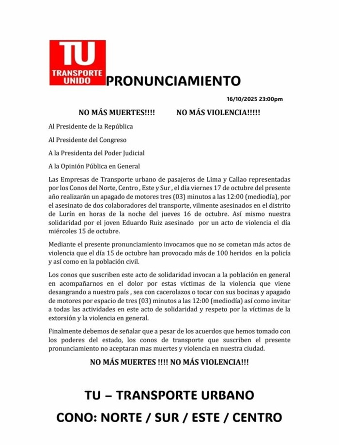 Las organizaciones de transporte público de Lima y Callao confirmaron que el viernes 17 de octubre ejecutarán un «apagado de motores» por tres minutos a partir del mediodía, en señal de luto por el homicidio de dos colaboradores del rubro en Lurín.