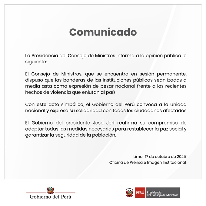 El Consejo de Ministros anunció el izamiento a media asta de las banderas como señal de duelo por los recientes episodios violentos registrados en el territorio nacional.