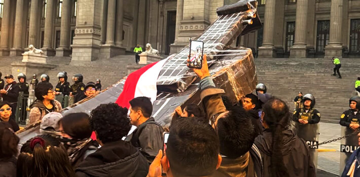 La jornada de protesta del miércoles 15 de octubre convocada por colectivos juveniles se inició de forma pacífica. La manifestación se desarrolló principalmente en los alrededores del Palacio de Justicia, punto central para los actos de movilización convocados después del nombramiento de José Jerí y la juramentación de su cuestionado Gabinete. La manifestación era … Sigue leyendo Manifestantes pasearon violín gigante con su banda presidencial (VIDEOS y FOTOS)