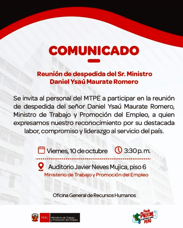 A través de una convocatoria emitida por la Oficina General de Recursos Humanos, se invitó al personal del MTPE a una “reunión de despedida” el viernes 10 de octubre a las 3:30 de la tarde, en el Auditorio Javier Neves Mujica. En otras palabras, un evento en pleno horario laboral, dentro de las instalaciones ministeriales y con el respaldo institucional que la burocracia peruana parece tan cómoda en otorgar incluso a las situaciones más cuestionables.