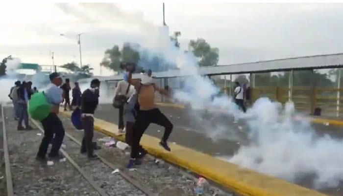 Enfrentamiento entre policías federales y centroamericanos lleva más de una hora sobre el puente internacional, hasta ahora se reportan al menos 10 heridos @JPSolisM @AztecaNoticias pic.twitter.com/QQO7f4Hz9D