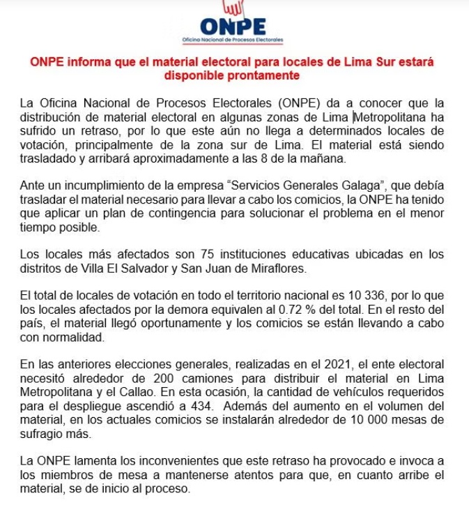 De acuerdo con las cifras de la institución, este retraso impacta al 0.72 % de los centros de votación en todo el territorio peruano. “En el resto del país, el material llegó oportunamente y los comicios se están llevando a cabo con normalidad”, puntualizó.