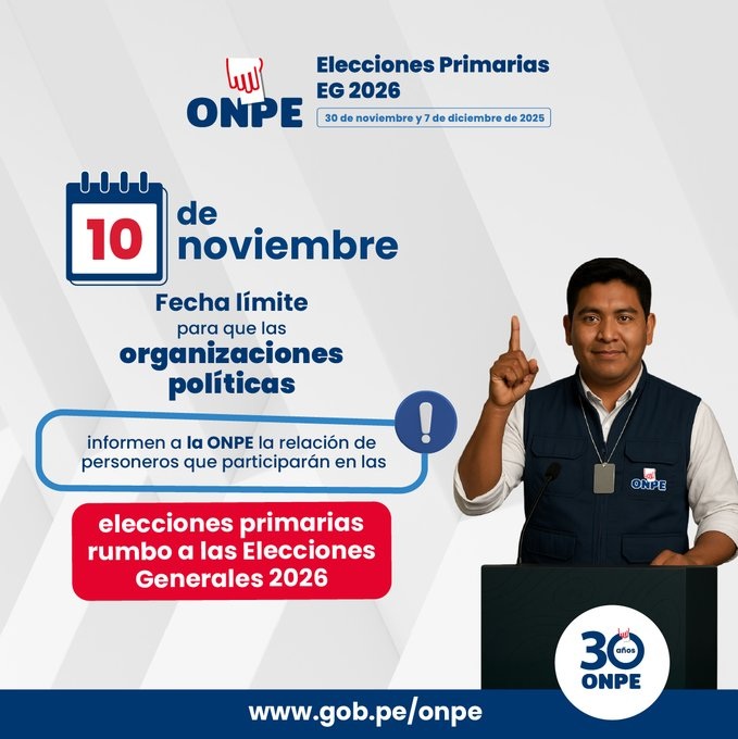 El Organismo Nacional de Procesos Electorales (ONPE) informó que las agrupaciones políticas cuentan hasta este lunes 10 de noviembre para inscribir a los personeros de mesa que supervisarán las candidaturas y listas durante los comicios internos del 2025, etapa previa a los comicios generales del 2026.