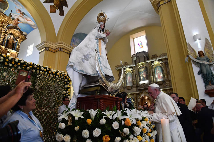 La Virgen de la Puerta de Otuzco es la patrona de La Libertad y del norte del Perú. Ella encabezó la fila de imágenes de santos y vírgenes que fueron trasladados hacia la plaza de Armas de Trujillo, luego de participar de la misa que encabezó el Papa Francisco en la explanada de Huanchaco.