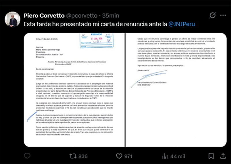 En su carta, Piero Corvetto señaló que, tras los inconvenientes técnico-operativos ocurridos durante la distribución del material electoral en ciertas áreas de Lima Metropolitana el pasado 12 de abril, y estando próximo a concluir el procesamiento de actas de la elección presidencial, consideraba necesario e inaplazable presentar su renuncia. Esto, con el objetivo de garantizar que la segunda vuelta de la elección presidencial se lleve a cabo en un ambiente de mayor confianza ciudadana hacia la ONPE.
