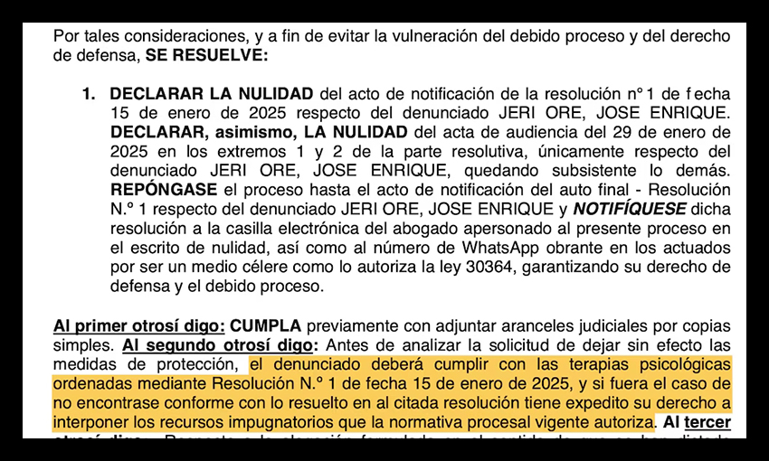 En la resolución, a la que tuvo acceso la prensa, se establece que el denunciado debe cumplir con las terapias psicológicas ordenadas en la Resolución Nº 1 del 15 de enero de 2025. Además, se aclara que Jerí tiene el derecho, si no está conforme con este dictamen, de presentar los recursos de impugnación permitidos por la normativa procesal vigente.