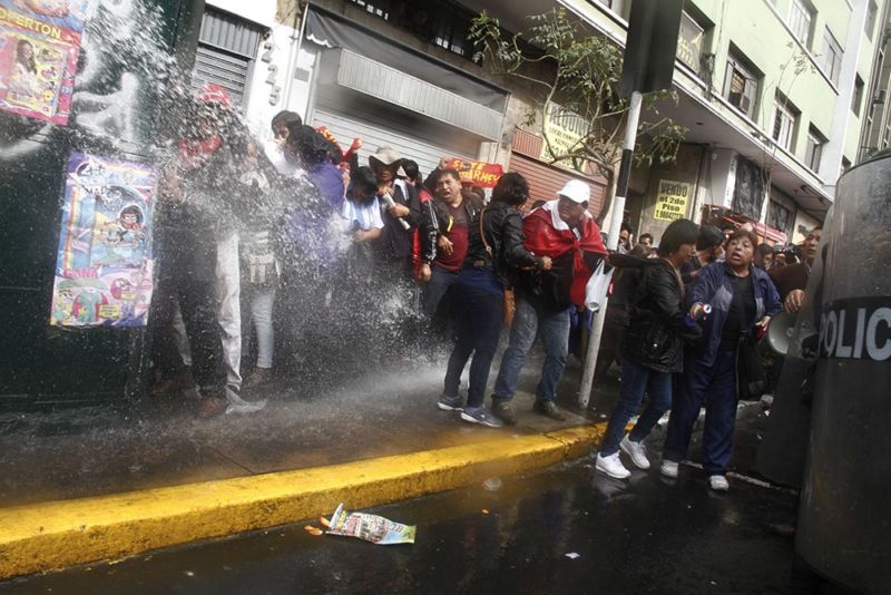 Para retirar a los profesores, la Policía empleó bombas lacrimógenas y chorros de agua, mientras efectivos antimotines formaron barreras para que retrocedieran los docentes, sacarlos de la vía principal y llevarlos hacia los jirones interiores.