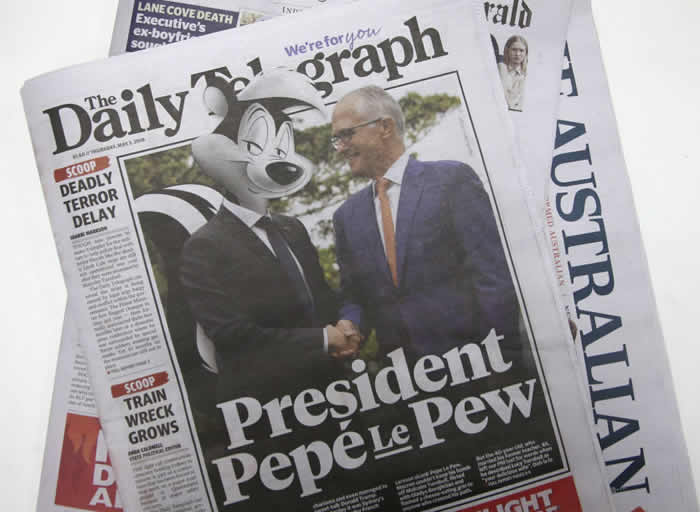 El tabloide australiano Daily Telegraph convirtió en chanza el error con un montaje que, bajo el titular Presidente Pepe Le Pew, muestra a Macron chocando la mano con Turnbull con la cabeza y la cola del popular personaje animado de Looney Tunes, la mofeta que en España se conoce como Pepe L’Amour. «Ooh la la!», añade el tabloide para burlarse del «deliciosamente delicioso error de Macron».
