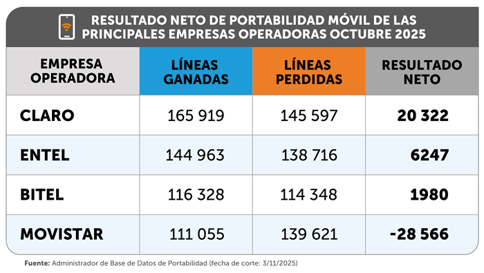 De acuerdo con la información proporcionada por el Administrador de Base de Datos de Portabilidad (ABDP) al OSIPTEL, Claro tuvo el mayor número de portaciones netas positivas (más líneas ganadas que perdidas) con 20 322 líneas, seguida de Entel (6247) y Bitel (1980). Por su parte, Movistar obtuvo un saldo neto negativo de 28 566 líneas, que refleja desafíos para su estrategia comercial en los próximos meses.