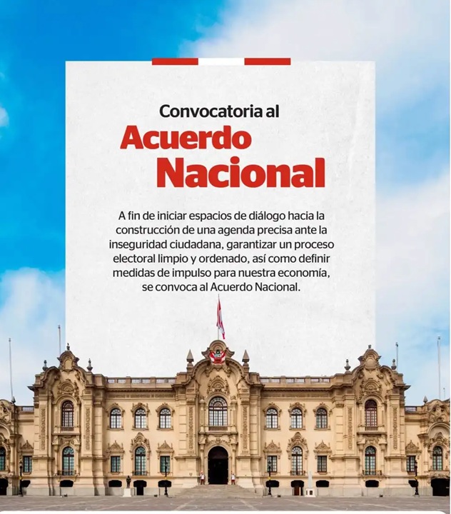 «A fin de iniciar espacios de diálogo hacia la construcción de una agenda precisa ante la inseguridad ciudadana, garantizar un proceso electoral limpio y ordenado, así como definir medidas de impulso para nuestra economía, se convoca al Acuerdo Nacional«, indica la comunicación que no detalla cuándo se realizará la reunión.