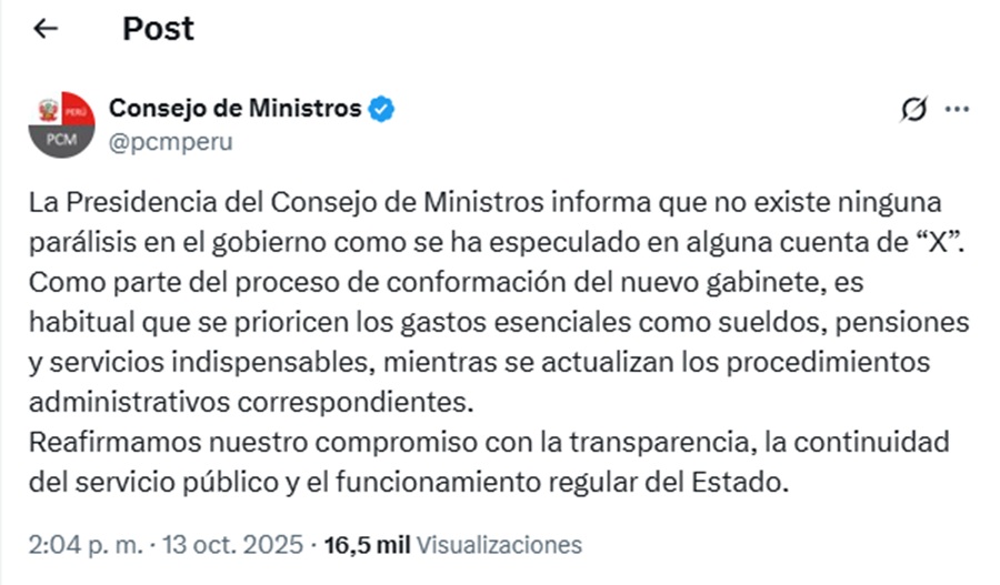 La Presidencia del Consejo de Ministros (PCM) desmintió este lunes 13 de octubre reportes sobre una supuesta paralización gubernamental que circularon en la plataforma «X».