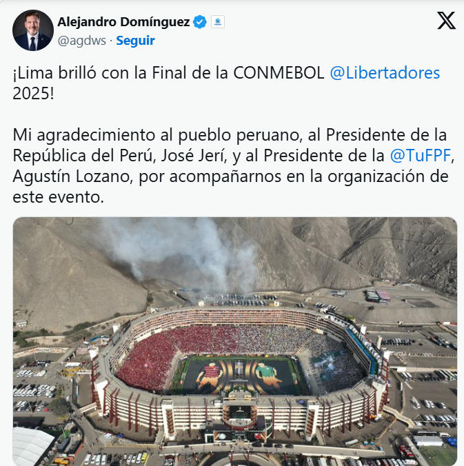 El presidente de la Confederación Sudamericana de Fútbol (Conmebol), Alejandro Domínguez, expresó hoy al pueblo peruano y a sus autoridades su agradecimiento por acompañarlo en la organización de la final de la Copa Libertadores 2025, que se jugó en Lima y permitió al Flamengo obtener el título al superar 1-0 al Palmeiras.