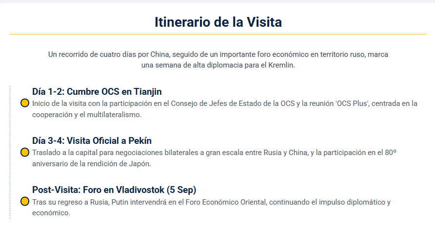 Putin visitará dos ciudades: Tianjin y Pekín, donde realizará su visita oficial. Posteriormente, regresará a Rusia y el 5 de septiembre, en Vladivostok, el presidente intervendrá en el Foro Económico Oriental, tras su presencia en el mayor evento diplomático del calendario político chino.