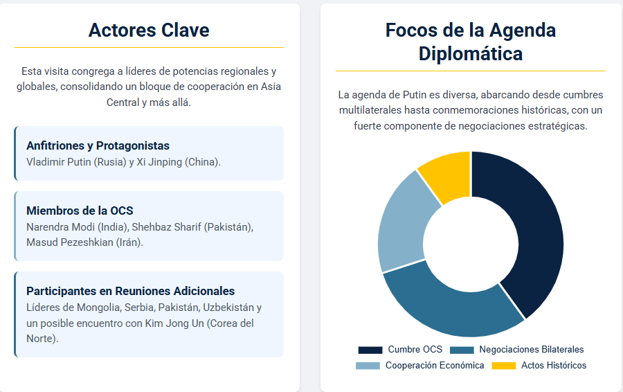 La cumbre ofrece a Putin la oportunidad de hablar directamente con Xi y Modi sobre el resultado de su reunión en Alaska con el presidente estadounidense Donald Trump y la posibilidad de alcanzar un acuerdo para poner fin a la guerra en Ucrania y en un momento en que India y China buscan una cooperación más profunda para afrontar las consecuencias económicas de la guerra comercial con Estados Unidos.