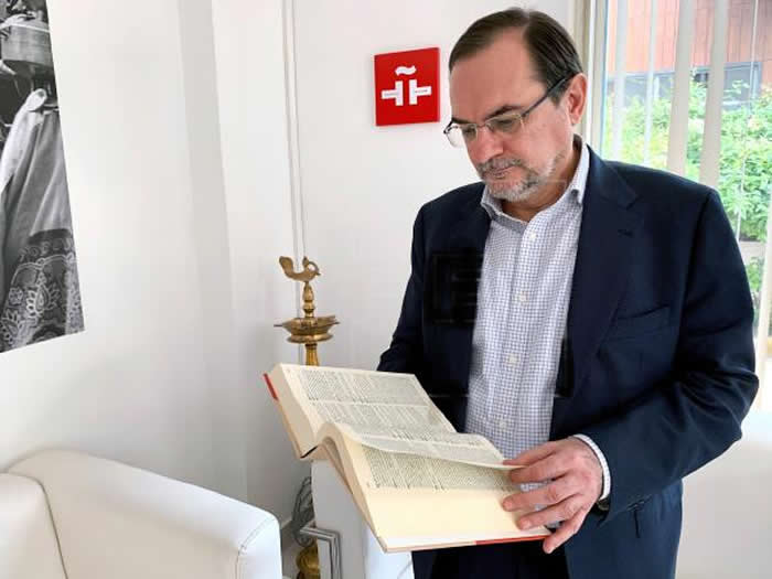 El doctor en Filosofía y Filología sánscrita y actual director del Instituto Cervantes de Nueva Delhi, Òscar Pujol, ojea un ejemplar de su primer diccionario sánscrito-español durante una entrevista con Efe en su despacho en Nueva Delhi (India), EFE/Moncho Torres