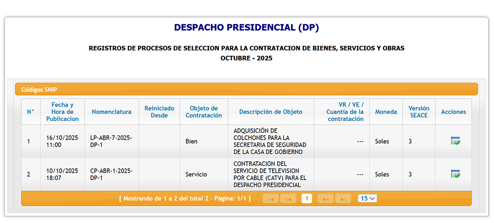 El segundo procedimiento, registrado el 16 de octubre a las 11:00 horas, tiene como finalidad la compra de colchones para la Secretaría de Seguridad de la Casa de Gobierno. Se trata específicamente de 100 colchones de plaza y media destinados al personal policial, oficiales, técnicos y suboficiales de la Policía Nacional del Perú (PNP) encargados de la custodia del Palacio de Gobierno, así como a quienes tienen a su cargo la seguridad del presidente José Jerí y su familia.