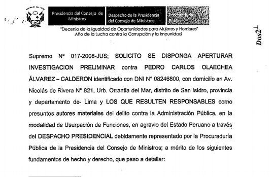 Según publica El Comercio, en un documento remitido a la fiscal de la Nación, Zoraida Ávalos, el abogado de la Presidencia del Consejo de Ministros solicitó abrir una investigación preliminar contra Pedro Olaechea y quienes votaron para autorizar al presidente de la Comisión Permanente a presentar una demanda competencial ante el Tribunal Constitucional por la disolución del Congreso.