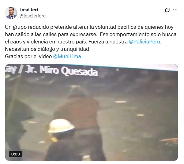 En una primera publicación en su cuenta de X. el presidente José Jerí, se refirió a los hechos de violencia causados por presuntos manifestantes con motivo de la movilización de este miércoles 15 de octubre.