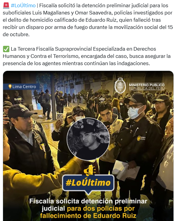 Por otro lado, se informó que tres generales de la Policía Nacional fueron suspendidos, luego de que el comandante general PNP Óscar Arriola anunciara el jueves que un suboficial de su entidad disparó contra Eduardo Ruiz Sanz (Trvko), durante las protestas del miércoles pasado en el Cercado de Lima.
