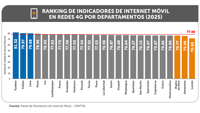 El promedio ponderado de los indicadores de internet móvil para redes 4G, durante el 2025, fue de 77.88 % a nivel nacional, lo que representó una mejora respecto al promedio obtenido en 2024 (75.60 %), informó el Organismo Supervisor de Inversión Pública en Telecomunicaciones (OSIPTEL).