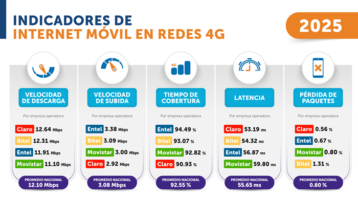 En el desagregado por indicadores, durante 2025, la velocidad de descarga (bajada) para redes 4G promedió 12.10 megabits por segundo (Mbps), un resultado mayor al reportado en 2024 (11.46 Mbps), lo que permitió que los usuarios pudieran conectarse a sus redes sociales, participar en videollamadas, emplear aplicativos, entre otros, en condiciones adecuadas.