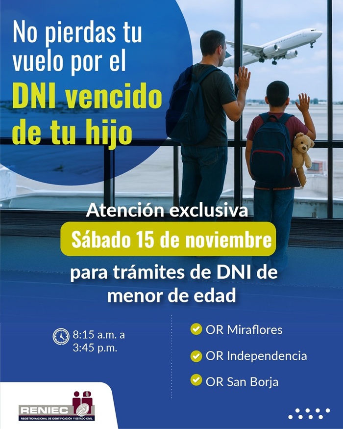 El Registro Nacional de Identificación y Estado Civil (Reniec) anunció que este domingo 16 de noviembre tres oficinas de Lima Metropolitana atenderán exclusivamente para el recojo del DNI.