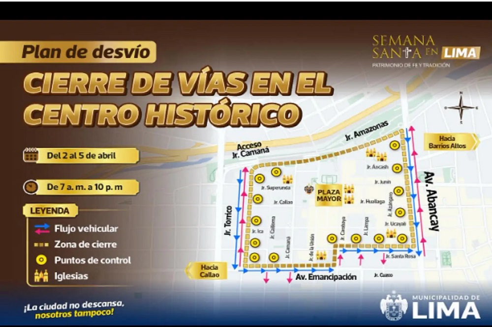 La Municipalidad Metropolitana de Lima (MML) activó un plan de desvío vehicular en el Centro Histórico con motivo de las festividades de Semana Santa 2026. La medida busca garantizar el orden y la seguridad de los miles de fieles y visitantes que concurrirán a la zona.