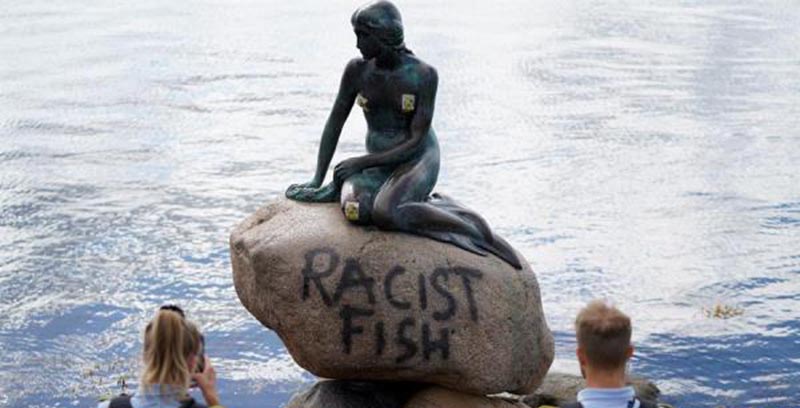 COPENHAGUE.- La estatua de la Sirenita de Copenhague, el símbolo turístico más reconocible de la capital danesa, ha aparecido este viernes pintada con la leyenda «racist fish» (pez racista), informaron las autoridades.