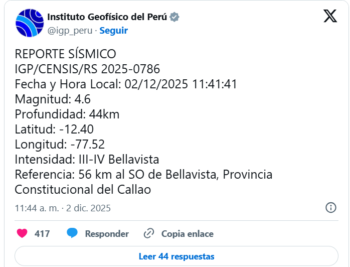 Según el Instituto Geofísico del Perú (IGP), el movimiento telúrico ocurrió a las 11:41 am con una profundidad de 44 kilómetros.