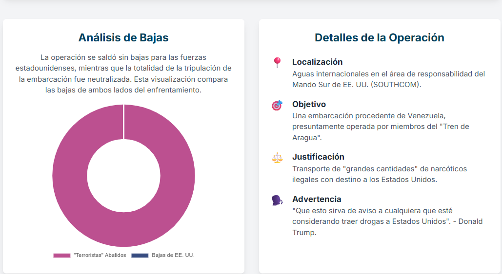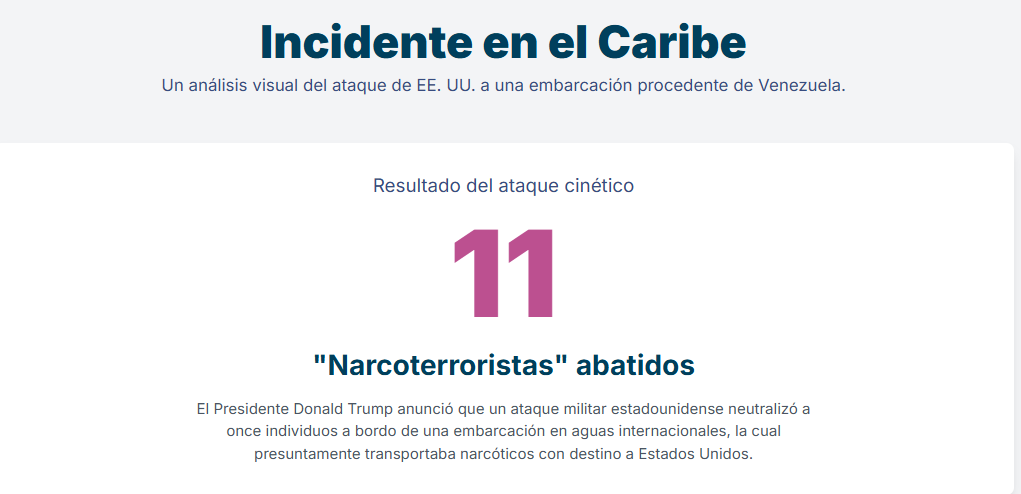 Posteriormente, Trump detalló que «el ataque ha resultado en la muerte de once terroristas en acción» y que «ningún miembro de las Fuerzas Armadas estadounidenses resultó herido». «Por favor, que esto sirva de aviso a cualquiera que esté considerando traer drogas a Estados Unidos», indicó a través de su perfil de la red social Truth Social, donde publicó un vídeo del momento del bombardeo.