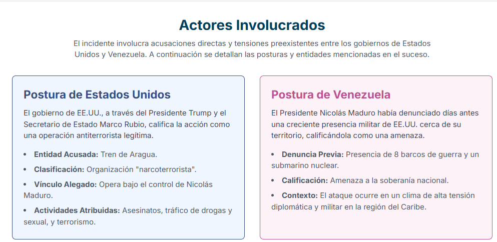 El inquilino de la Casa Blanca explicó que el Ejército «llevó a cabo esta mañana un ataque cinético contra narcoterroristas del Tren de Aragua en el área de responsabilidad del Mando Sur de Estados Unidos (SOUTHCOM)». «Se encontraban en aguas internacionales transportando narcóticos ilegales con destino a Estados Unidos», aseveró.