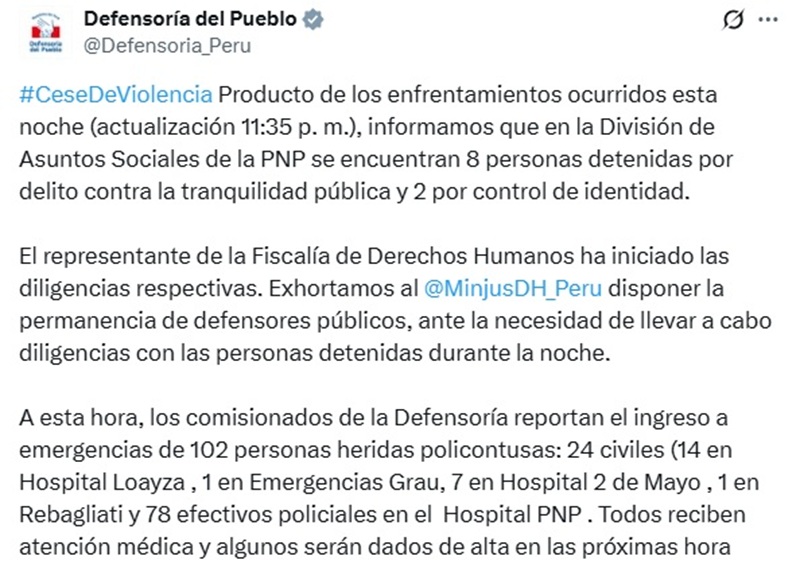 La Defensoría del Pueblo indicó que 24 manifestantes y 72 agentes son los heridos.»Todos reciben atención médica y algunos serán dados de alta en las próximas horas», subrayó en su cuenta en X, al tiempo que confirmó ocho detenidos debido al «delito contra la tranquilidad pública» y dos por «control de identidad».
