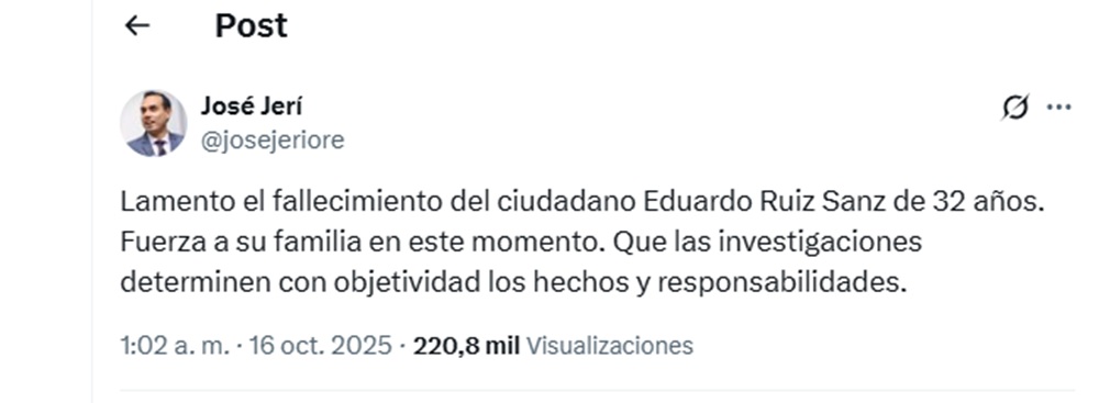 El presidente José Jerí, expreó su pesar por el fallecimiento del manifestante, identificado como Eduardo Ruiz Sanz, de 32 años. «Fuerza a su familia en este momento. Que las investigaciones determinen con objetividad los hechos y las responsabilidades», apuntó en X.