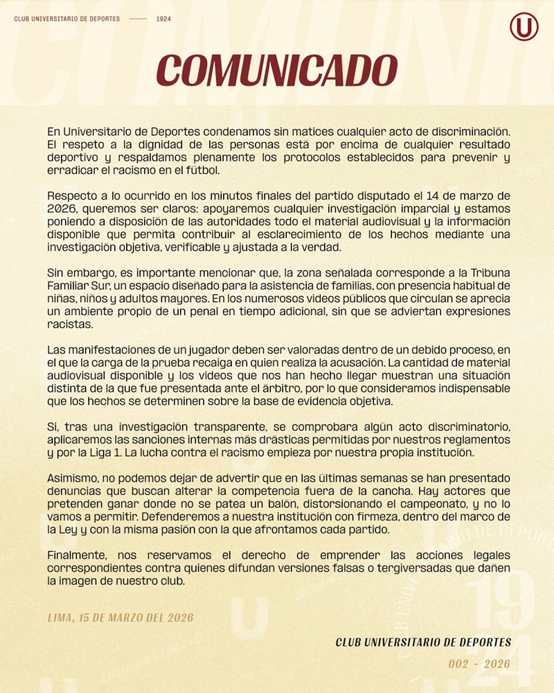 Desde la vereda contraria, el club blanquiazul manifestó que «El racismo no tiene lugar en nuestra sociedad ni en nuestras canchas”, sostuvo la institución íntima. Por su parte, la directiva de Universitario rechazó cualquier acto discriminatorio y ofreció todas sus grabaciones audiovisuales para facilitar el esclarecimiento del caso de forma transparente.