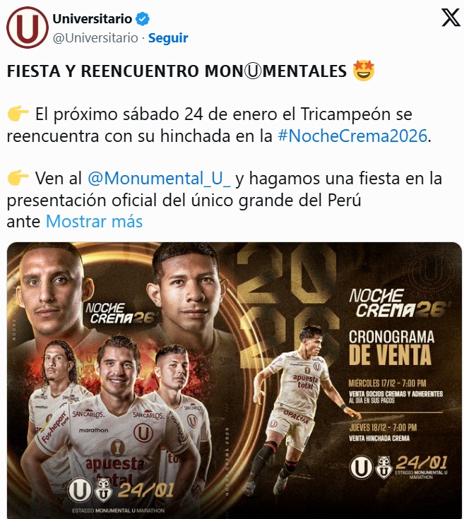 Universitario de Deportes anunció que la presentación del plantel para la temporada 2026, conocida como la ‘Noche Crema’, se desarrollará el sábado 24 de enero contra la Universidad de Chile. El tricampeón del fútbol peruano divulgó los detalles del evento a través de sus plataformas digitales.
